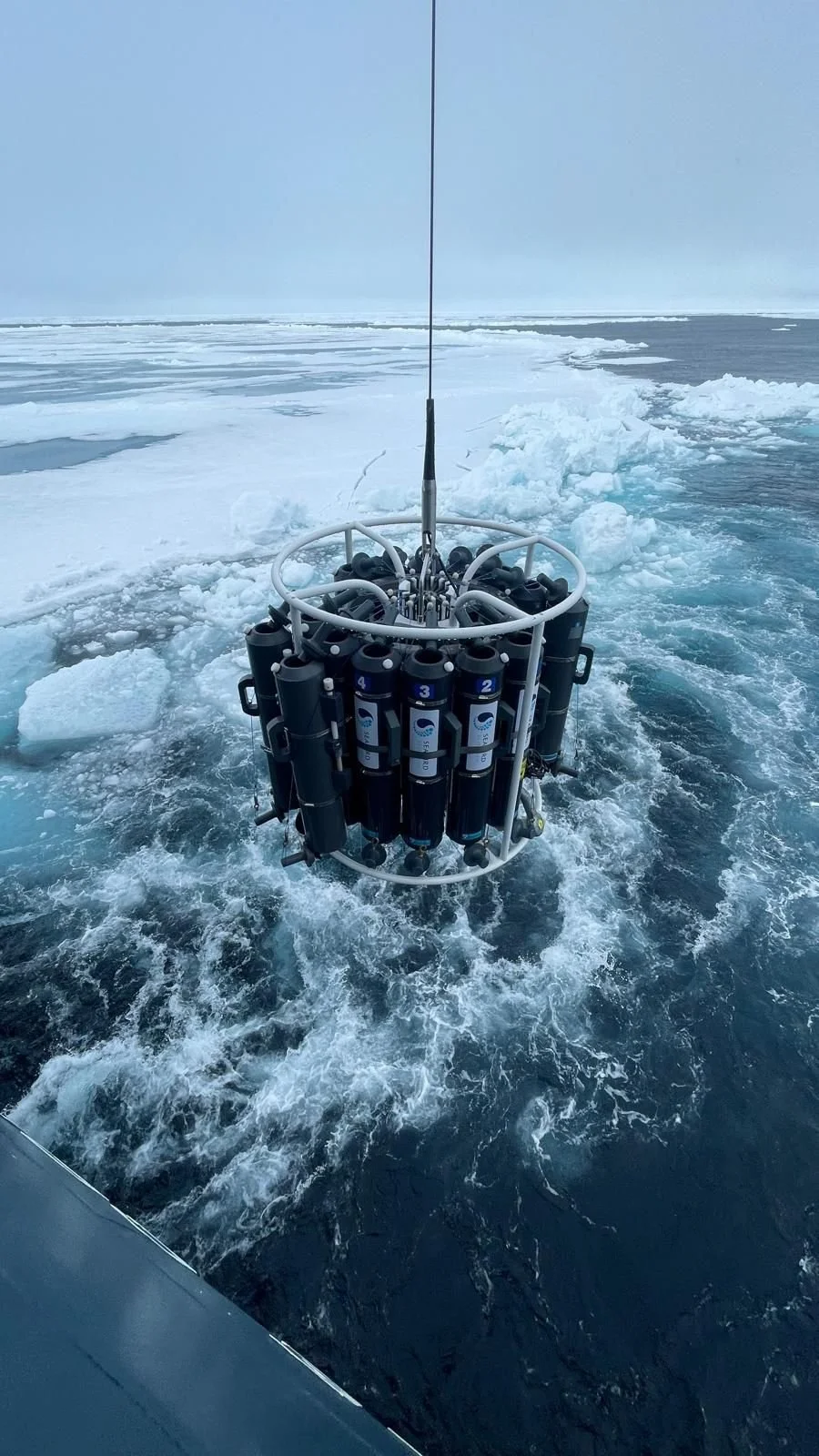 During the expedition, a series of CTD (Conductivity–Temperature–Depth) casts were conducted along a trans-Arctic transect, including locations near glaciers, the Arctic ice edge, and the geographic North Pole.